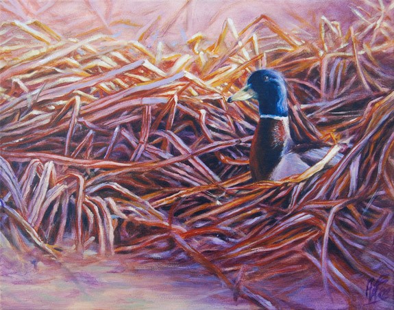 Acrylschilderij van een wilde eend in de ochtendzon.